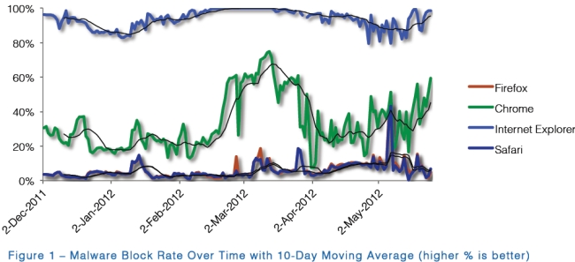 IE consigue una media de bloqueo de malware del 95%, superando por mucho al resto, ya que Chrome varía del 13% al 74%, y Firefox y Safari no superan el 6%.